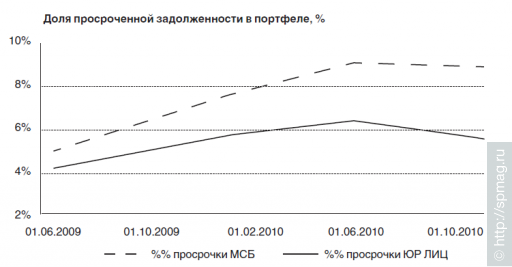 Восстановление экономики идет очень неравномерно. Больнее всего нестабильность «ударила» по сектору малого и среднего бизнеса (далее – МСБ), именно ему сейчас и тяжелее всего «понимать себя на ноги». Подтверждением тому могут служить данные Центробанка РФ о размере просроченной задолженности в кредитных портфелях банков. Так, если доля просроченной задолженности в портфеле юридических лиц за 2010 год снизилась на 10 процентов (с 6 до 5,4 процентов), то ситуация с просрочкой платежей у малого и среднего бизнеса обратная – она выросла на 17,5 процентов (с 7,5 до 8,8 процентов).